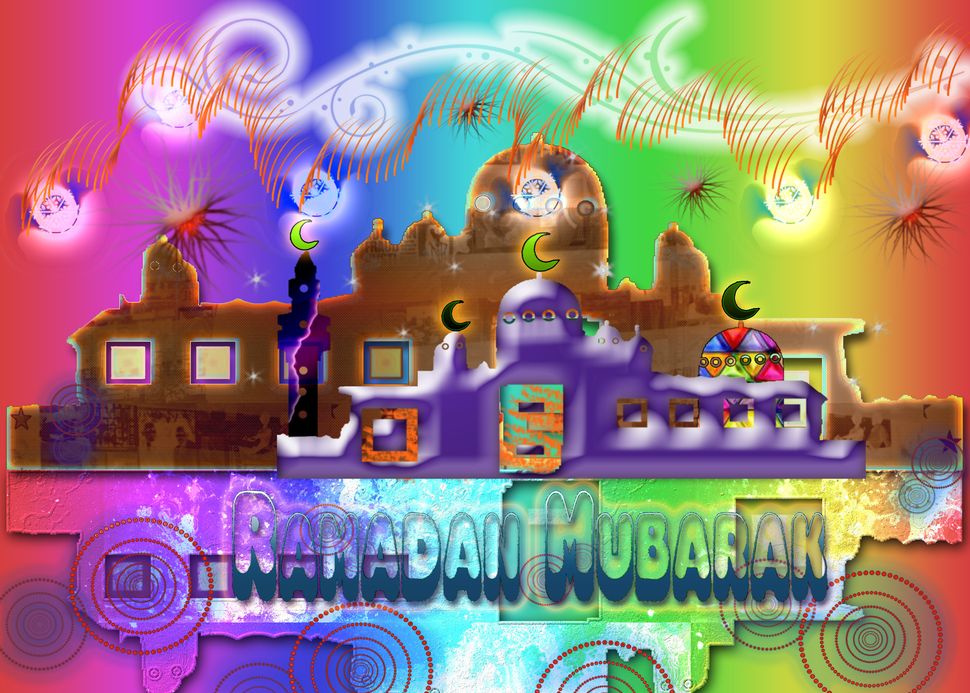 Ramadan Mubarak in the black robe with the stars overlooking the luminous beacons